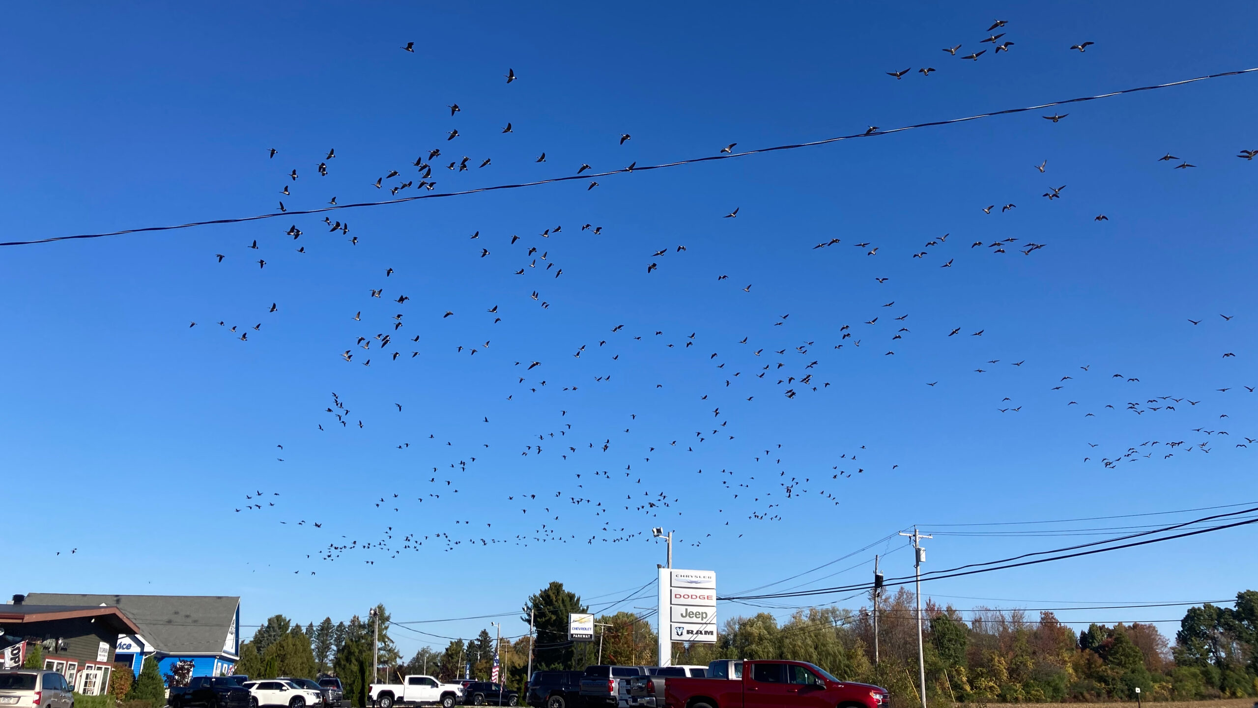 Zur gleichen Zeit steht Babsy vor der Werkstatt, als ein vorbeikommender LKW eine riesige Schar Wildgänse von einem Feld aufscheucht, worauf hunderte Gänse sich lauthals schreiend in die Luft erheben. Lauthals schreiend scheint heute in Mode zu sein.