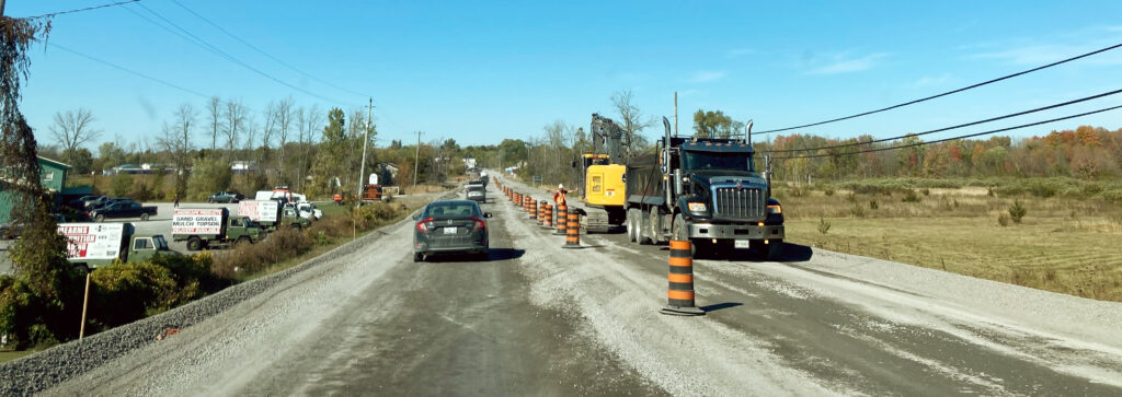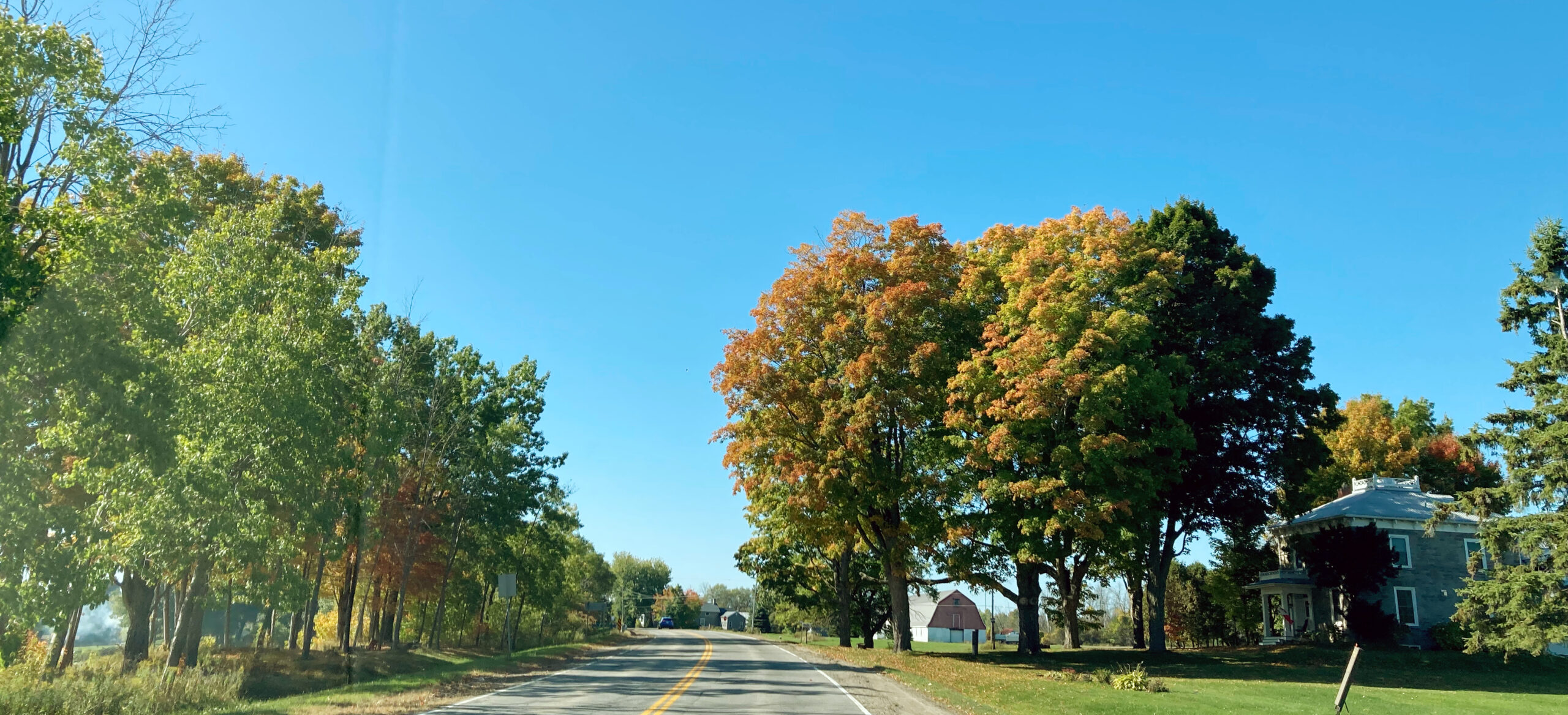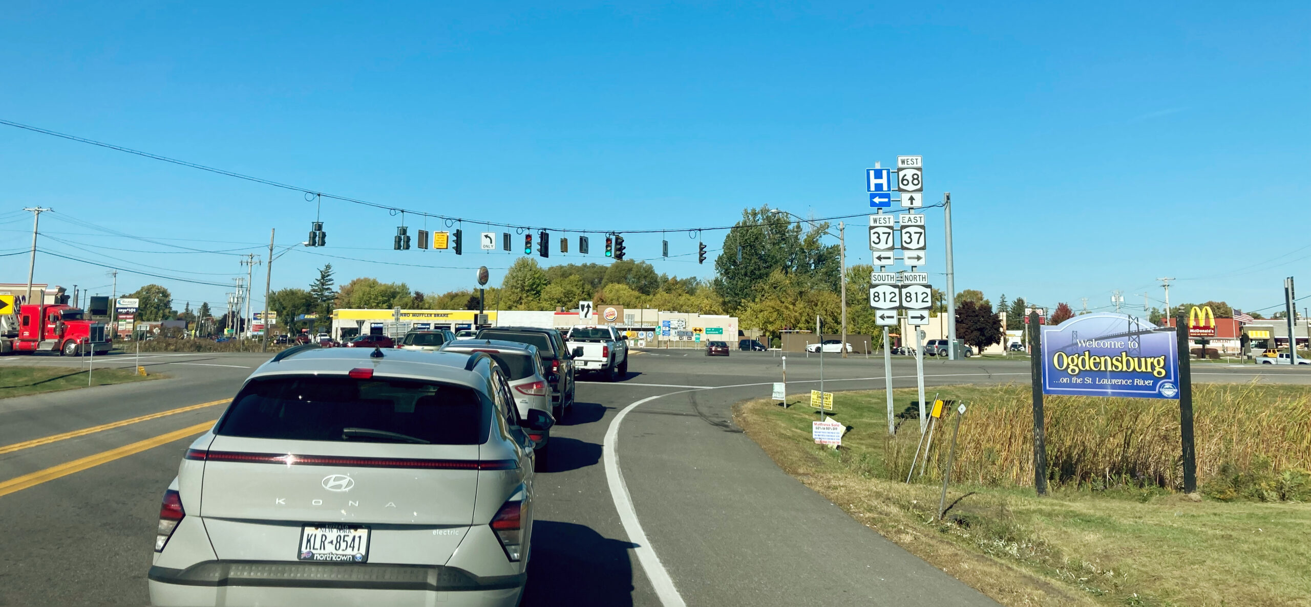 Auf der County Road 68 geht es von Potsdam zur kanadischen Grenze bei Ogdensburg. Übrigens, der rote LKW links im Bild wird bis über die Grenze direkt hinter uns herfahren.