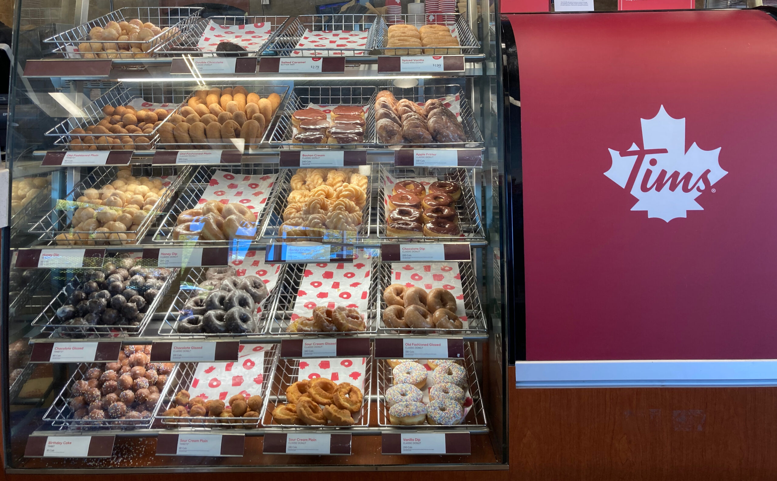 Aber hier gibt es viel mehr Donuts etc als anderswo (es gibt noch eine weitere Vitrine in dieser Größe) und eine große Anzahl an Kaffeevarianten.