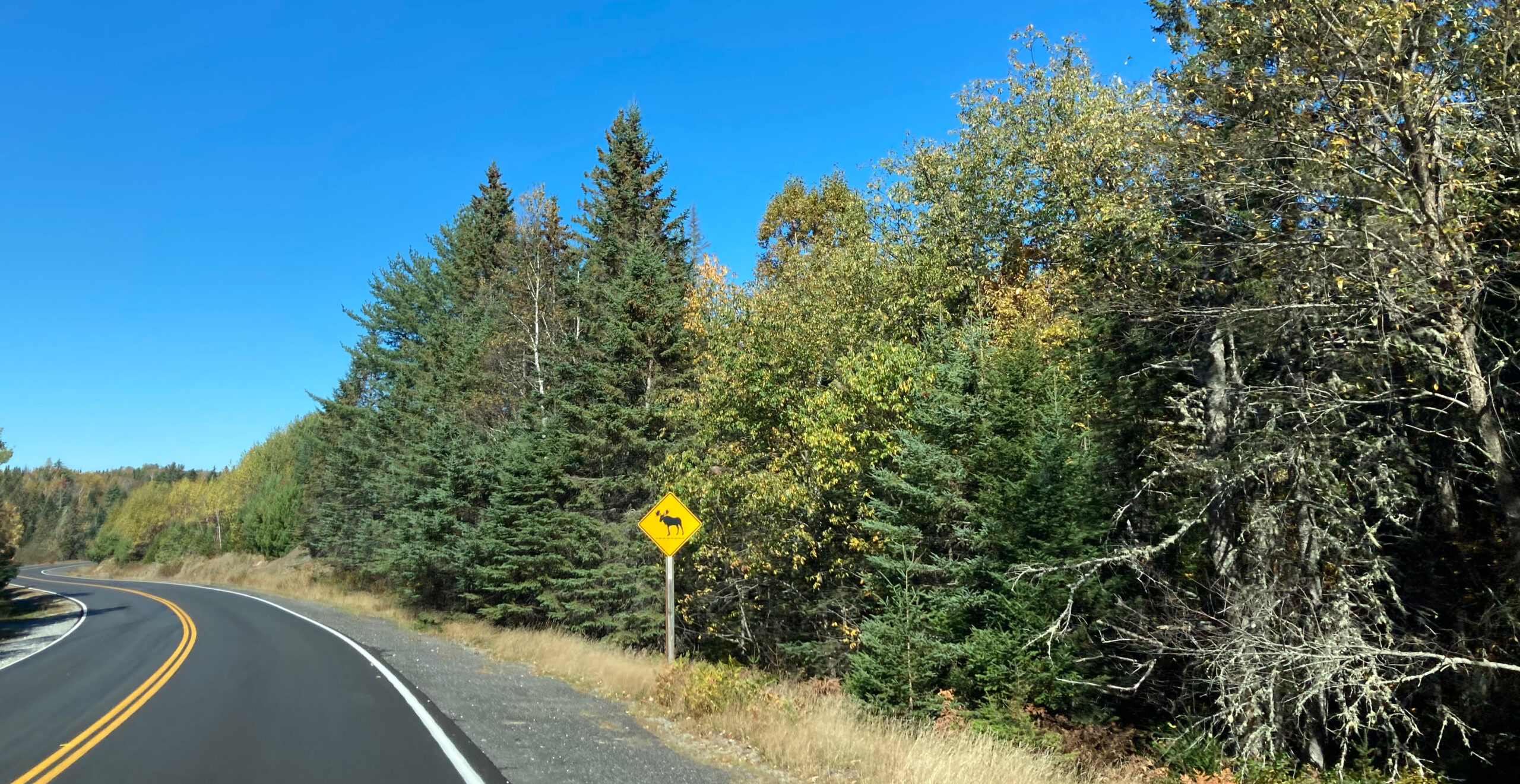 Eingedenk des armen Elchs in der Höhle wollen wir hier eines der Warnschilder zeigen, die auf die Gefahren von Elchen auf der Straße hinweisen. Sie sind riesig und niemand möchte mit so einem Tier zusammenstossen. Wir haben bisher leider noch keinen gesehen.