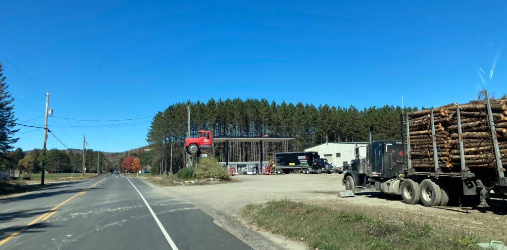 Nach ein paar Meilen kommen wir an einem Parkplatz für Holztransporter vorbei. Ein paar Hoizzahra haben wir schon gesehen. Niemand fährt schneller als ein Hoizzahra. Es ist angsteinflössend, wenn so ein LKW mit unzähligen geladenen Tonnen Holz im Rückspiegel immer größer wird.