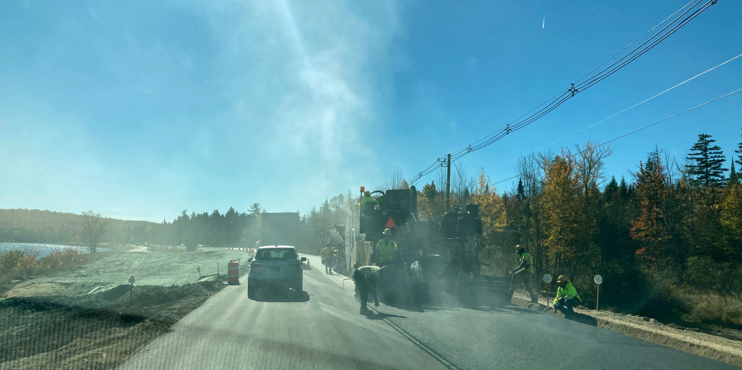 Oh, wir haben den Bautrupp eingeholt, der erst vor kurzem die Straße, auf der wir unterwegs sind, hergerichtet hat. Kurz müssen wir warten, dann können wir die lange Baustelle durchqueren. Die Nebelschwaden riechen nach Asphalt.