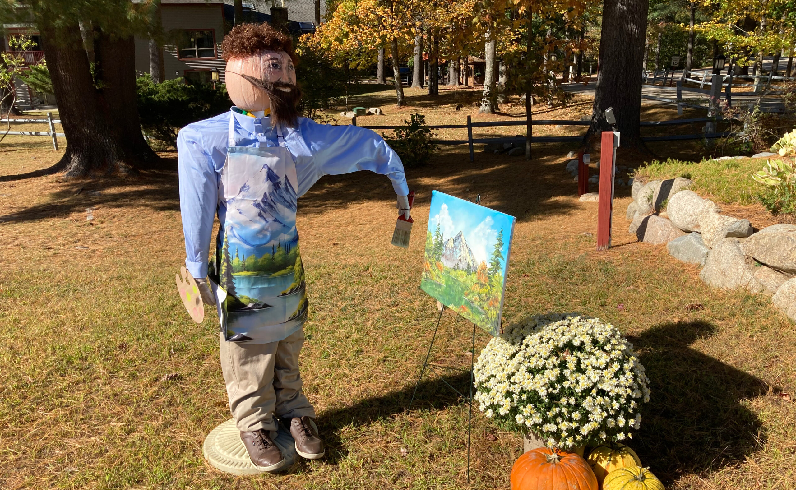 Halloween ist die Zeit der geschmückten Gärten und wir kommen an einer ganz besonderen Installation vorbei. So besonders, dass wir fast eine Meile später umdrehen, um doch noch ein Foto zu schießen. Wer ihn kennt, wird ihn auch gleich erkennen – Bob Ross.
