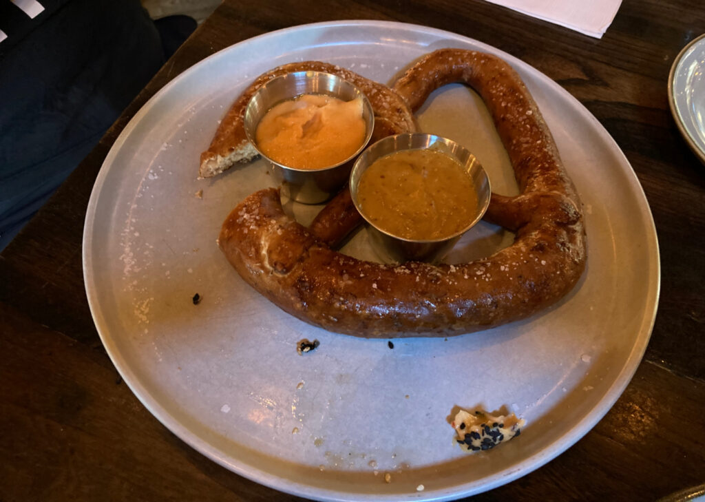 Noch etwas typisch amerikanisches in diesem Zusammenhang wollen wir testen, Pub Pretzels mit Bierkäse und Senfaufstrich. Iiinteressant.