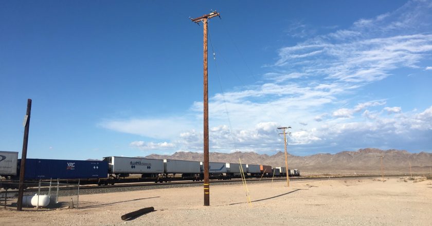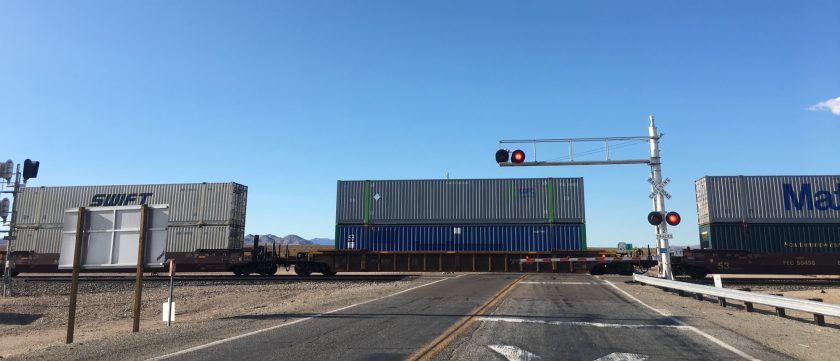 Plötzlich sehen wir neben uns einen schier endlos langen Güterzug, gezogen von 6 Lokomotiven, der hinter einem Hügel hervorkommt. Kurz später stoppt uns eine Rail Road Crossing. Ding – ding – ding. Wieder ein Klischee, das wir von der Liste streichen können.