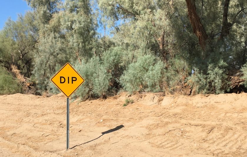 Die Straßen sind gerade, alle 10 Meilen kommt eine Kurve und die wird zur Sicherheit mit Verkehrszeichen angekündigt, dann geht es wieder meilenweit geradeaus. Dafür gehen sie ständig auf und ab, in Form von sogenannten Dips (Wellen in der Fahrbahn). Zeitweise so tief und steil, daß es einem beim Durchfahren den Magen aushebt. Gefährlich werden sie beim (seltenen) Überholen, da der Gegenverkehr in ihnen verschwinden kann und plötzlich vor einem auftaucht.