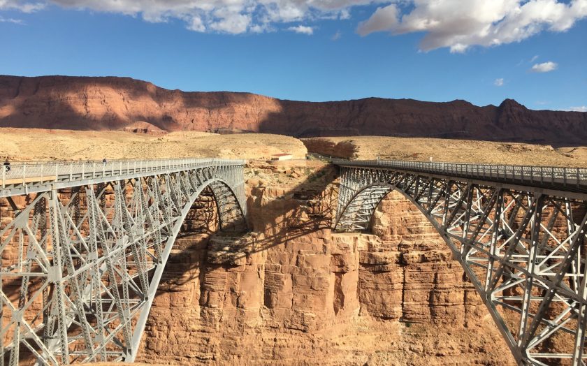 Am späten Nachmittag erreichen wir den Marble Canyon, der von zwei Metallbrücken in 143 Metern Höhe überspannt wird, eine für Fahrzeuge, die andere für Fußgänger.