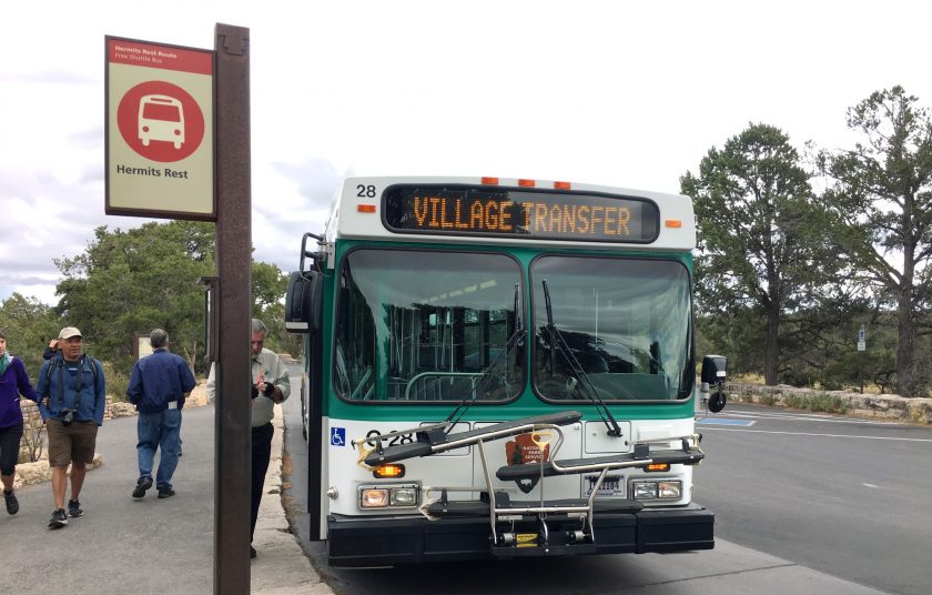 Der Nationalpark hat mehrere Zugänge, wir benutzen South Rim. Von Flagstaff sind es etwa 90 Minuten Fahrt bis zum Eingang, wir erreichen die Zufahrt gegen 8 Uhr und vor uns stehen gerade einmal 5 Autos. 🙂 Wir suchen uns einen Parkplatz und begeben uns zum westlichen Ende des Parks, in Richtung Hermits Rest. Die Distanzen sind nicht zu unterschätzen, der Park, der am Rand des Grand Canyons entlang verläuft, ist etwa 30 Meilen lang. Es gibt 3 Buslinien, die Besucher durch den Park transportieren, alle 15 Minuten.