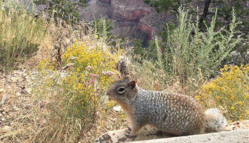 Und werden gleich von Squirrels besucht, die kleinen Kerle wohnen in den Spalten und Ritzen der Felsen und sind mittelmäßig scheu, auf 2 Meter kommt man schon heran. Außer man findet ein sehr keckes Exemplar, daß einem fast zwischen die Schuhe rennt. Der Naseweis am Bild unten stand 20 cm von Babsys entfernt, als sie auf den Auslöser drückte.